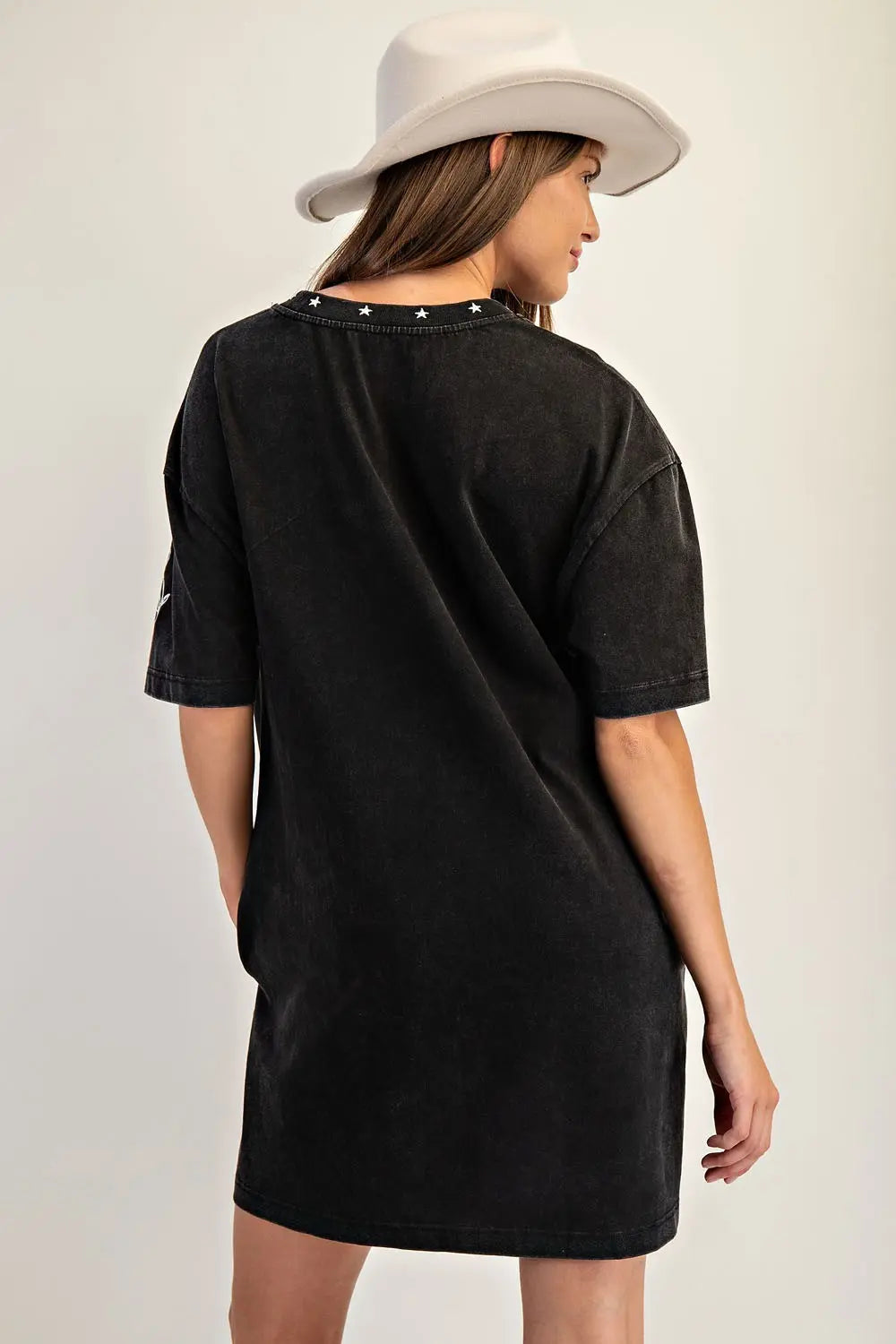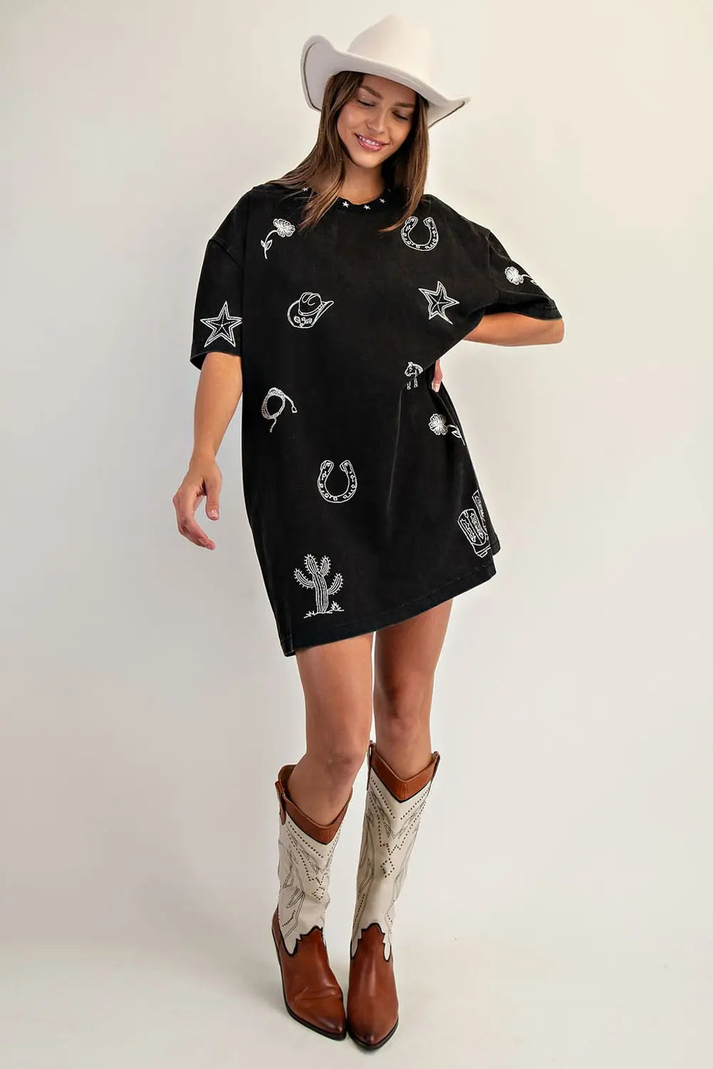 Saddle up in style with the Shiloh Western Print T-Shirt Dress, the perfect blend of comfort and cowgirl charm. This black washed t-shirt dress features playful white western-inspired graphics — from cowboy hats and boots to horseshoes and cacti — giving it that laid-back desert vibe you’ll love. Made from soft, breathable cotton with a relaxed fit, it’s ideal for casual days, concerts, or rodeo nights. Pair it with your favorite cowboy boots and hat for a complete western-chic look.